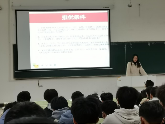 会议伊始,两位辅导员结合《中国共产党发展党员工作细则》就团员推优的具体条件进行了详细阐述,主要考察各位学生的思想品质、政治觉悟、入党动机、综合表现和现实情况等。随后,两位辅导员布置了此次2022级学生的团员推优工作,包括公布推优名额、参加入党积极分子培训班要求和确立为入党积极分子后的培养教育工作等。