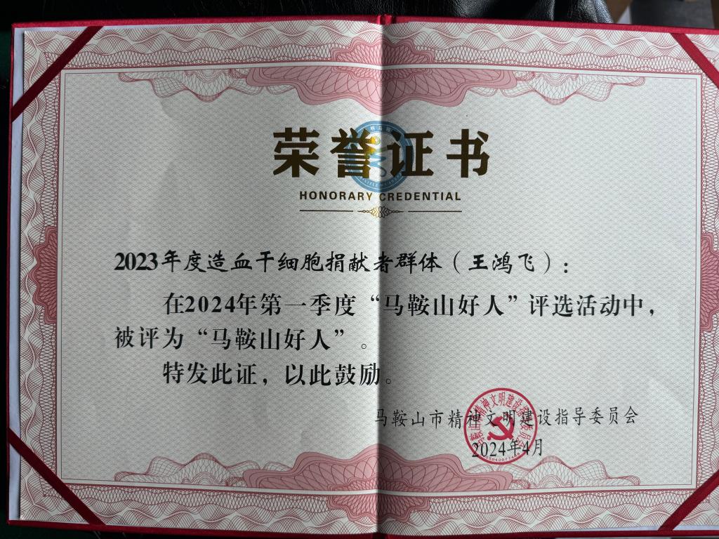 学子——造血干细胞捐献者王鸿飞同学出席仪式,获评2024年第一季度“马鞍山好人”荣誉称号。