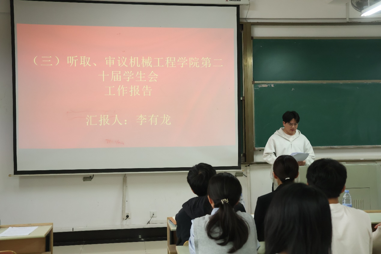 第九次学生代表大会暨第五次研究生全体大会于秀山校区机械楼407会议室召开。学院党委副书记、副院长陈庆林出席会议,院团委负责人王丹丹,团委副书记彭勇刚、陈洁以及第二十届学生会主席团成员和来自各年级的164名本科生代表、全体研究生代表齐聚一堂,共话青春使命,共绘工作蓝图。会议由王子玥主持。