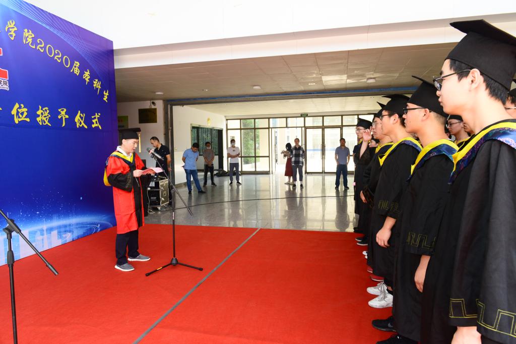 院长王孝义宣读2020届安徽省品学兼优毕业生和校优秀毕业生名单。由学工部何伟部长为安徽省品学兼优毕业生颁奖,由徐柳根书记为校优秀毕业生颁奖。副院长汪永明宣读2020届校友联络员名单,由王孝义院长颁发证书。