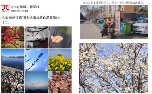 本次活动要求同学们从“美景”,“纪实”,“亲情”三个方面展开。有的同学留意了家乡周围的美丽景色,捕捉了赏心悦目的美景,用相机留下这个不同寻常的春天必然要到来春的迹象。有的同学用相机记录了疫情防控期间在做什么?周围的人在做什么?以及感动、触动的瞬间。有的同学拿起相机,记录居家时刻与家人朋友相互依偎的温暖瞬间,全家福,居家做游戏,室内运动锻炼等,处处温馨。
