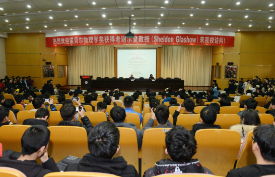 格拉肖教授在学术会议中心报告厅作了题为“Serendipity in Science: Does Science Evolve by Blind Chance? Or by Intelligent Design(科学里的偶然发现:科学进步源于机遇还是精心规划)”的讲座。讲座由顾明言主持。数理科学与工程学院等相关学院400余位师生聆听了大师的精彩演讲。讲座中,格拉肖深入浅出地介绍了自己从事科学研究的经历和成就以及粒子物理研究带给我们对未知世界的探索和认识。他以世界粒子物理研究为主线,介绍了从1930年泡利预测中微子开始一直到21世纪近一个世纪的粒子物理研究历程,分享了他和各个不同阶段粒子物理研究发展的关系。在互动环节,现场师生踊跃提问,格拉肖耐心细致地回答了大家提出的问题。讲座结束后,全场报以热烈掌声。