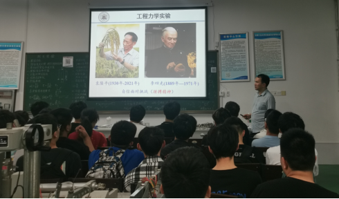 省级课程思政示范项目负责人黄志来老师进行示范,讲授拉伸、压缩和纯弯曲实验,黄老师从学生的认知水平出发,通过实验的置信度、可度量、可操作性、可观测性、误差等讨论实验的本质,引入了丰富的生活实例进行讲解,如:考试其实也是测试,一定存在误差,所以用平时成绩补偿误差,以提高置信度,平时成绩是“科学的结果”。在讲解至难点时,引入科学家自信面对挑战的故事,鼓励同学们勇于直面困难。从“秦始皇统一度量衡”的意义,自然引出力学测试的标准,以及标准分级和官网等。以培养“获取数据、理解任务、应用知识”基础能力为本,引导学生进行“分析问题、综合和评价方案等”高层次思考。如:从铸铁压缩沿45度斜面破坏的感性认识,至强度理论的理性思考,再引导学生观察斜面偏转得如何考虑,以及目前的研究进展等。