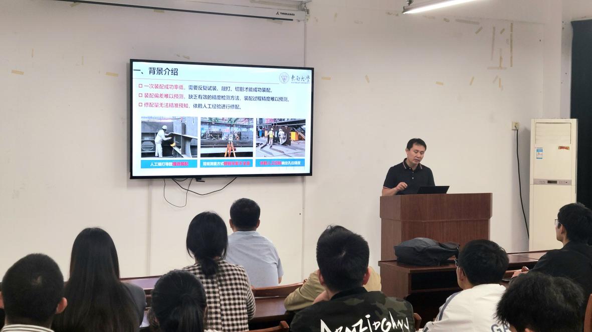 刘晓军教授的报告内容包括数字孪生技术的发展背景、概念定义、方法原理和实现手段;重点介绍了数字孪生技术在驱动三维模型装配、实现工艺装配过程模拟和结果预测中的相关技术难点、解决方案和应用场景等,展示了大量工程应用案例,对装配模型构造、误差传递、场景构造、人机协同等关键技术和问题进行了说明。报告内容丰富、讲解生动精彩,参加的报告的师生被报告内容所吸引,在短时间内对数字孪生的这一新技术有了较全面的了解,加深了概念理解,开阔了知识视野。最后参会的教师和学生与刘晓军教授进行了深入的交流。