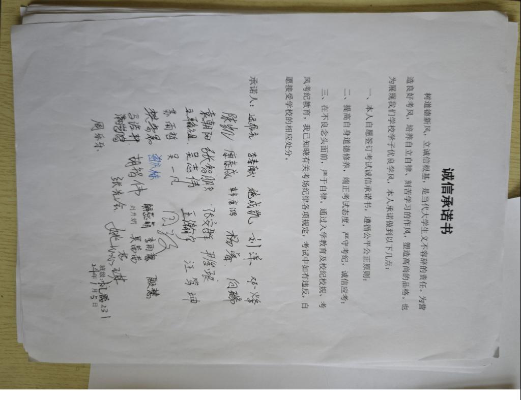 辅导员带领同学们学习了《中华人民共和国教育法》、《国家教育考试违规处理办法》等法律法规,介绍了学校关于严肃考风考纪的各项政策,倡导同学们遵守考风考纪,合理规划时间,认真复习,诚信考试。紧接着,通过列举考试作弊的相关案例对同学们进行了警示教育,提高同学们对诚信考试的认识,并强调考试是对心理状态的一次磨炼,大家要调整好自身状态,加强心理建设。最后,辅导员组织各位同学阅读并签署了《诚信考试承诺书》,同学们纷纷表示将积极备考、诚信应考,严守考风考纪,以实际行动营造公平公正考试氛围。(撰稿:张敏; 审核:濮莹萍;周环;陈庆林)