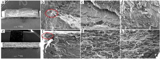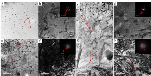 低应力幅值下T8样件:e-明像场,f-暗像场;高应力幅值下T8样件:g-明像场,h-暗像场