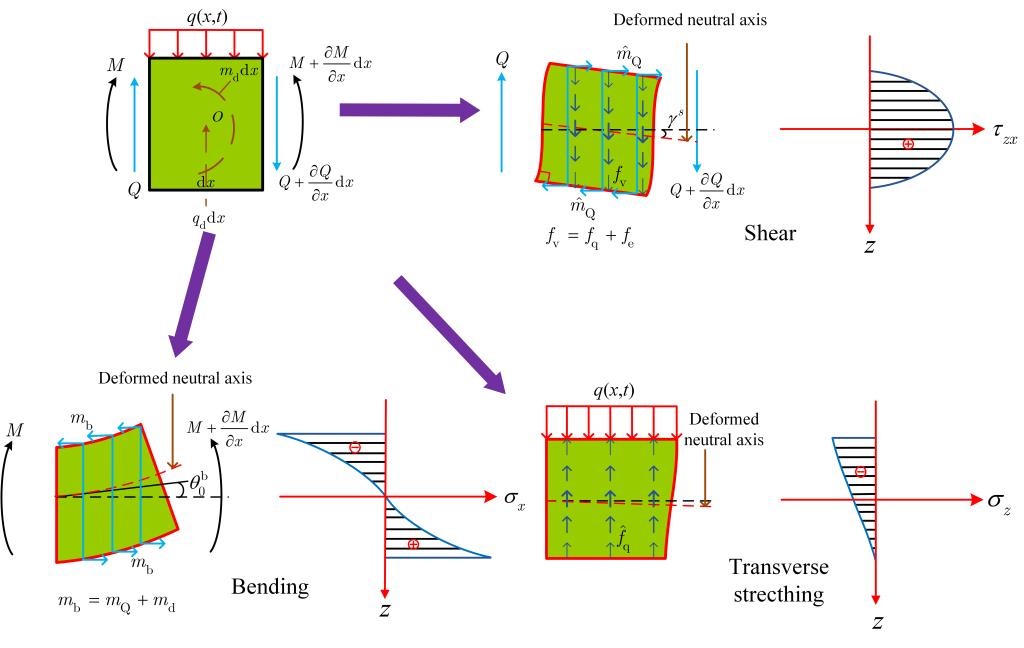 此外,为准确预测平面深梁的振动、弯曲和屈曲响应,本研究采用变形分解方法,提出了一种精确、高效而通用的高阶剪切变形梁理论。该理论基于弹性力学,将梁的变形分解为弯曲、剪切和挤压三个相对独立的部分进行精确分析,并根据不同变形间的内在联系(平衡关系)避免了额外变量的引入,针对平面梁的静力、振动和屈曲问题获得了高精度的响应结果。物理意义清晰、计算方便高效、响应预测精准,可进一步应用于非均质材料、多场耦合、强非线性等复杂梁问题。相关研究成果发表在《Engineering Structures》,论文与浙江大学合作完成,NT动漫